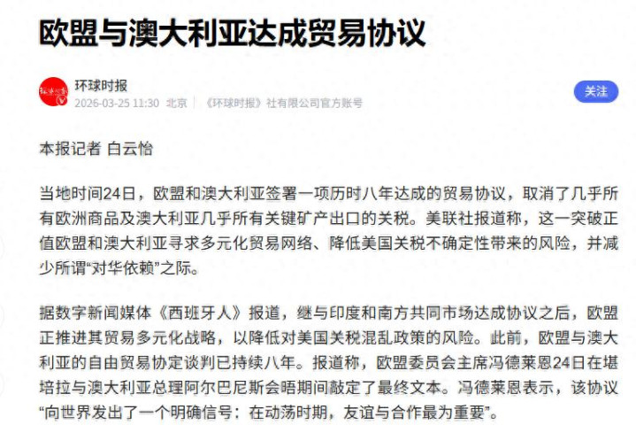 《对冲 “好意思国风险”! 欧盟与澳大利亚罢了买卖公约》,海外金融报