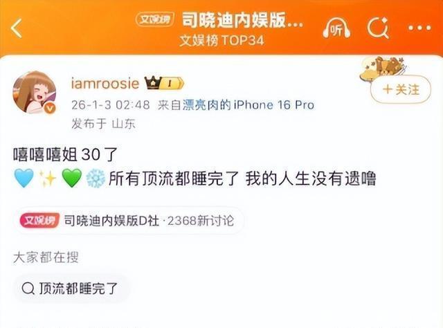 睡遍男星 1月3号凌晨三点,大大批东谈主还在睡梦中,网红司晓迪倏得在三大酬酢平台同步炸屏。 两小时二十多条动态,中枢就一个:她要在30岁前睡遍内娱顶流,还径直点了鹿晗、蔡徐坤、范丞丞等十多位男星的名字,说如故跟其中几个处过亲密关连。