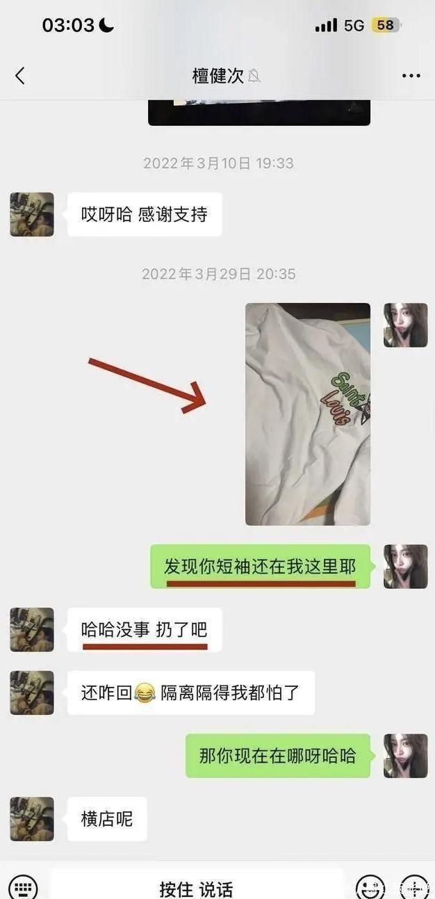 又放了跟檀健次的聊天纪录截图,内部有“短袖落我这了”等依稀语言,细节几乎拉满。