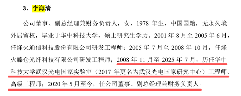 算作前程光子发起东说念主、董事、副总司理兼财务崇敬东说念主的李海清,其任职履历或存矛盾与合规问题。招股书暴露,李海清2008年11月至2025年7月历任华中科技大学武汉光电国度实验室(后改名武汉光电国度商讨中心)工程师、高档工程师,且2020年5月起便担任前程光子多项高管职务。但华中科技大学西席个东说念主主页暴露,李海清现在仍为该校在任西席,且在2021年6月武汉光电国度商讨中心工会换届中,当选工会副主席兼组织委员,该职务属于明确的行政护士职务。