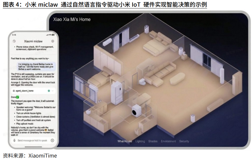 东兴证券此前发布研报提到,miclaw是一款原生的系统级AI智能体,领有不成替代的系统级引申权限,在功能性和生态系统整合方面远超基于安卓的第三方AI器具,它粗略自主调治进步50项系统器具和IoT(物联网)劳动,实现了小米“东说念主车家生态”的无缝贯穿。