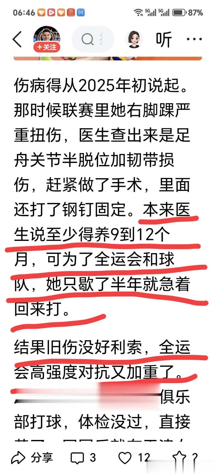 近期总有自媒体发文,说什么李盈莹手术后大夫说需要休息9-12个月,李盈莹为了干预全运会,提前复出,导致伤病加剧。