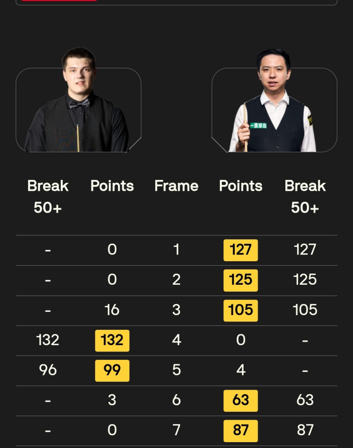 首日比赛中,中国选手12东谈主出战,周跃龙晋级32强;肖国栋、赵心童和张安达挺进64强;王信伯、韩富源、刘杨、徐嘉锐无缘64强;张家玮、赵翰洋、贺国强和雷佩凡无缘32强。中国军团取得四胜八负的战绩。