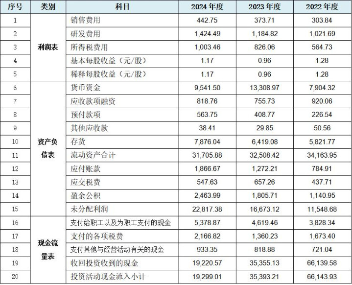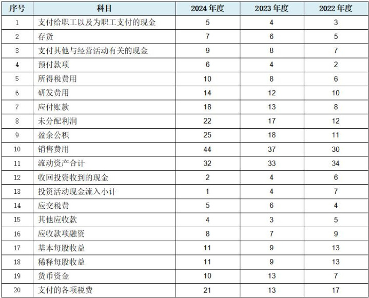 从上表可见,就利润表数据而言,如前文所述刊行东谈主因2024年度存在收入较为昭着的翘尾表象,故刊行东谈主未出现昭着的买卖收入与买卖成本相干数据的法则性变化,但利润表中仍出现了销售用度、研发用度及所得税用度等较为重要的5项数据法则性变化。就金钱欠债表数据而言,刊行东谈主出现较具代表性的存货、应答账款及未分派利润等10项较为中枢金钱欠债表数据数据的法则性变化,其中的存货数据与买卖成本相干。就现款流量表数据而言,刊行东谈主出现以支付给职工以及为职工支付的现款及支付的各项税费为代表的5项现款流量科目数据法则性变化。