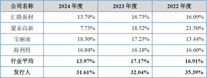 从上表可见,刊行东谈主的概述毛利率分手为35.39%、32.04%、31.61%,不但为可比企业中的最高水平且为行业各年平均值16.91%、17.17%、13.97%的2倍操纵水平,毛利率水平当作响应上市盈利能力的紧要方针,刊行东谈主可能短少旨趣地为同业可比敌手的2倍的客不雅性天然也难以根究。