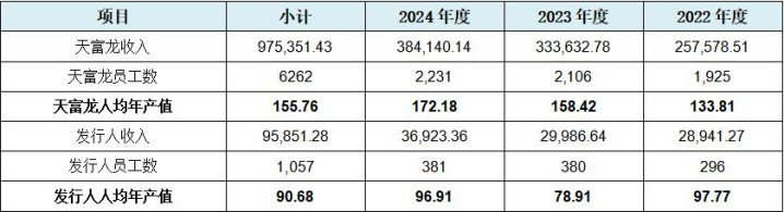 依据刊行东谈主与天富龙招股书中暴露的的买卖收入数据及职工东谈主数,咱们不错经营出二者东谈主均年产值的比较情况,如下表所示: