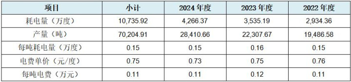 从上表可见,刊行东谈主每吨产能的平均耗电量为0.15万度、0.16万度、0.15万度,每吨产能的平均电费分手为0.11万元、0.12万元、0.11万元,概述平均每吨电量能耗约为1,500度电,概述平均每吨电费能耗约为0.11万元。