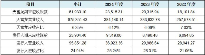 刊行东谈主平直比较的蒙泰高新并不啻存在2024年度未盈利的问题,且蒙泰高新主要居品为丙纶长丝,其卑鄙应用箱包织带、水管布套、门窗毛条、服装等,与刊行东谈主的主营居品及卑鄙应用场景相似度也不高。而刊行东谈主评释的汽车产业链账期举座相对较长而导致刊行东谈主应收账款盘活率低于可比公司平均水平的说辞也可能不够严谨。与刊行东谈主一江之隔的天富龙(603406.SH)位于扬州(仪征)汽车工业园,不异以永逝化涤纶短纤维的研发、坐褥和销售为主业,据其招股书中信息炫耀“相较于其他再生涤纶短纤维企业,公司以汽车内饰等应用领域为主”,而天富龙暴露的财务方针中的应收账款盘活率情况,如下表所示: