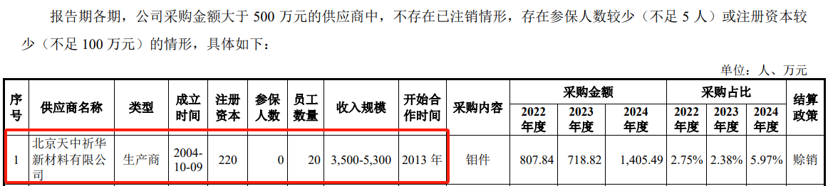 证据招股书露出,广泰真空在2025年前三季度的第一大供应商为“北京天中祈华新材料有限公司”,公司向其采购钼件、金额为1719.12万元,占同时公司采购钼件材料总金额2506.98万元的70%傍边。2024年也向该供应商采购钼件材料1405.49万元。《审核问询函的回复》露出,该供应商建设于2004年、注册成本为220万元,广泰真空于2013年与其缔造相助,该供应商收入限制高达3500万元至5300万元,职工有20东说念主但无参保东说念主员。