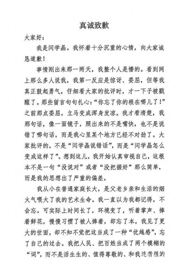 杏彩官网 闫学晶,发文谈歉