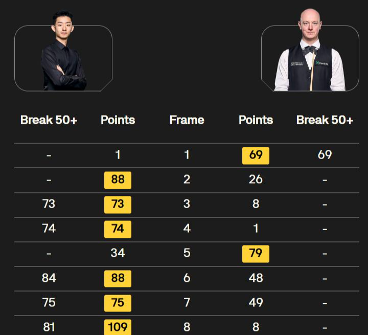回顾之后,塔猜亚跌跌撞撞赢下了第5局,霍金斯则是两杆50+,连赢三局,以5-3的比分放胆了上半场的争夺。