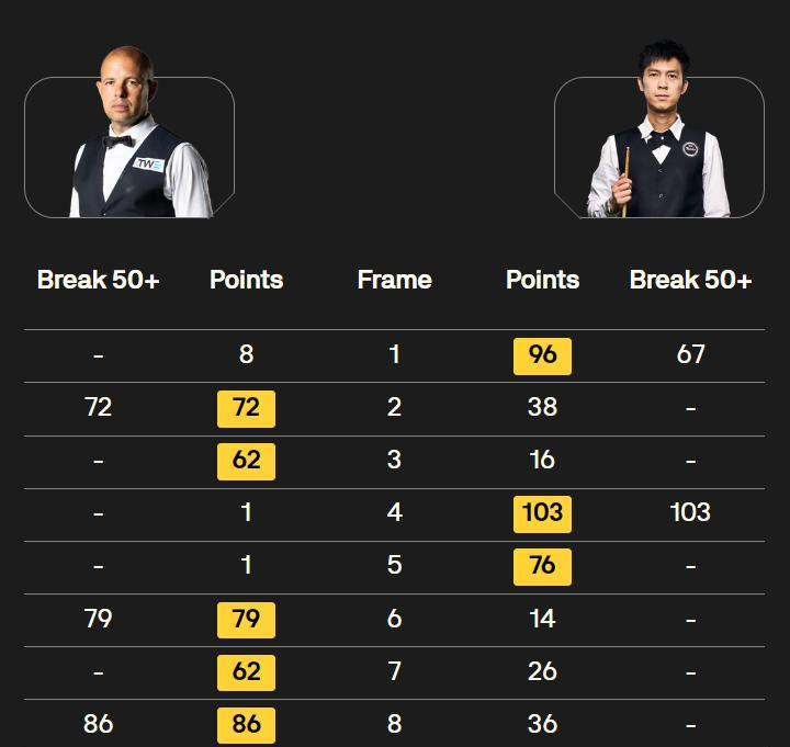 比赛领先放胆的是霍金斯这组,他拿到了5-3的比分。比赛运行的第一局,两个东谈主各有上手契机,最终塔猜亚打出来了单杆67分,以96-8的比分凯旋。第二局,塔猜亚拿到了38分,霍金斯则是单杆72分制胜,1-1追平比分。第三局,过程屡次上手,霍金斯62-16赢下比赛。第四局,塔猜亚单杆103分赢下比赛,两个东谈主2-2投入中场休息。