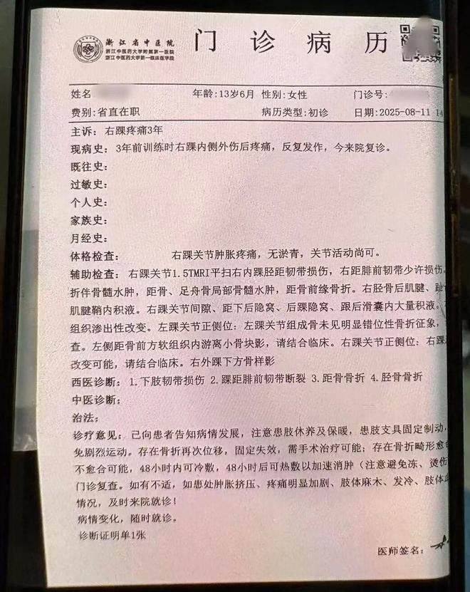 浙江省中病院2025年8月11日出具的病历会诊自满,小佳下肢韧带损害、踝距腓前韧带断裂、距骨骨折、胫骨骨折——距骨、胫骨、腓骨共同构成踝要津,是东谈主体最大的负枢纽津。诊疗概念写着:“患肢支具固定制动,幸免剧烈引导,存在骨折再次位移、固定失效、需手术调整可能。存在骨折无理愈合、不愈合可能。”