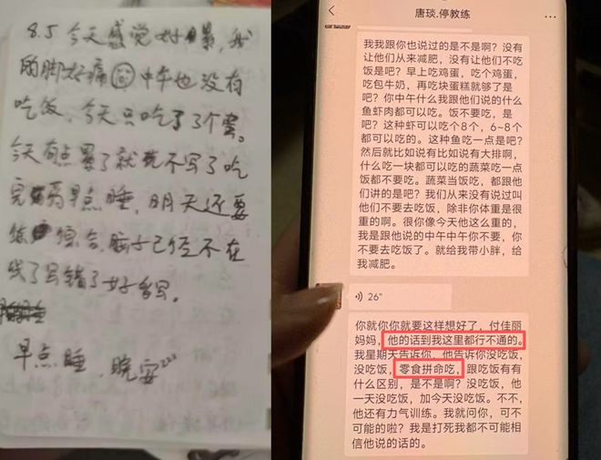 唐琰曾知会晋守宣,称“施淳厚(和唐琰搭档的另一老师)说了,每天吃饭2顿,指定组内队员打饭,不行进食堂,什么时候体重踏实了再进食堂”。