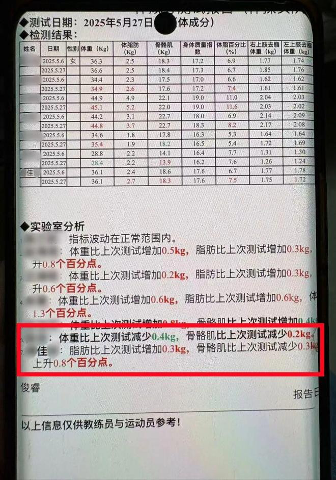 13岁的小佳,体魄处于助长发育期。南风窗防备到,在2025年5月的体重检测陈述中,时隔21天,7名引导员当中,包括小佳在内,5东谈主出现了体重或脂肪加多。而独一体重裁汰的引导员,骨骼肌减少。