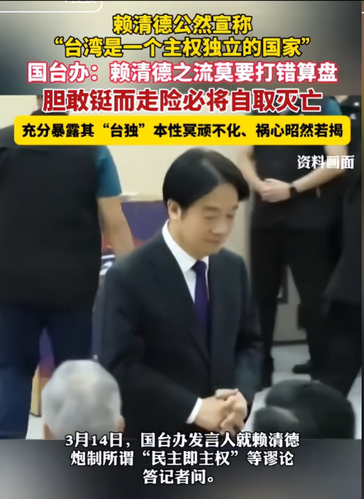 赖清德以致公开叫嚣台湾是“主权寂静的国度”,妄称台湾问题不是中国内务,这种数典忘祖的步履,不仅抵拒历史事实,更是在玩火。